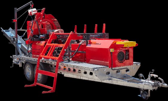SP-480 – Mobile is a machine used for preparing firewood and fireplace wood in large quantities. This device combines in one operating cycle cutting wood with a chainsaw and splitting it with a wedge and an unloading conveyor belt.