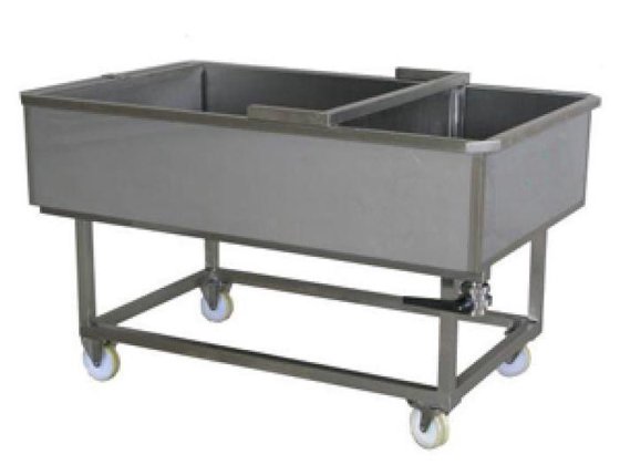 Composition: deepened cheese table support on wheels side draining grids outflow valve